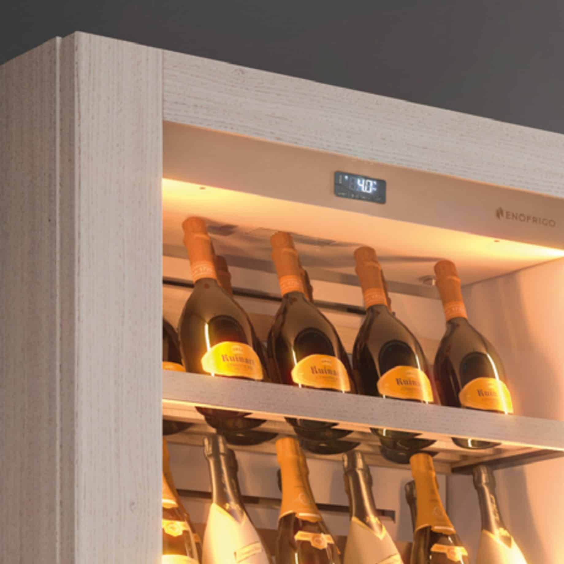 Odlično unutrašnje osvetljenje usmerava pažnju na boce vina koje se čuvaju unutra. LED svetla i pametno dizajnirana unutrašnjost stvaraju utisak dubine i proizvode refleksiju svetlosti koja poboljšava prezentaciju vina.
