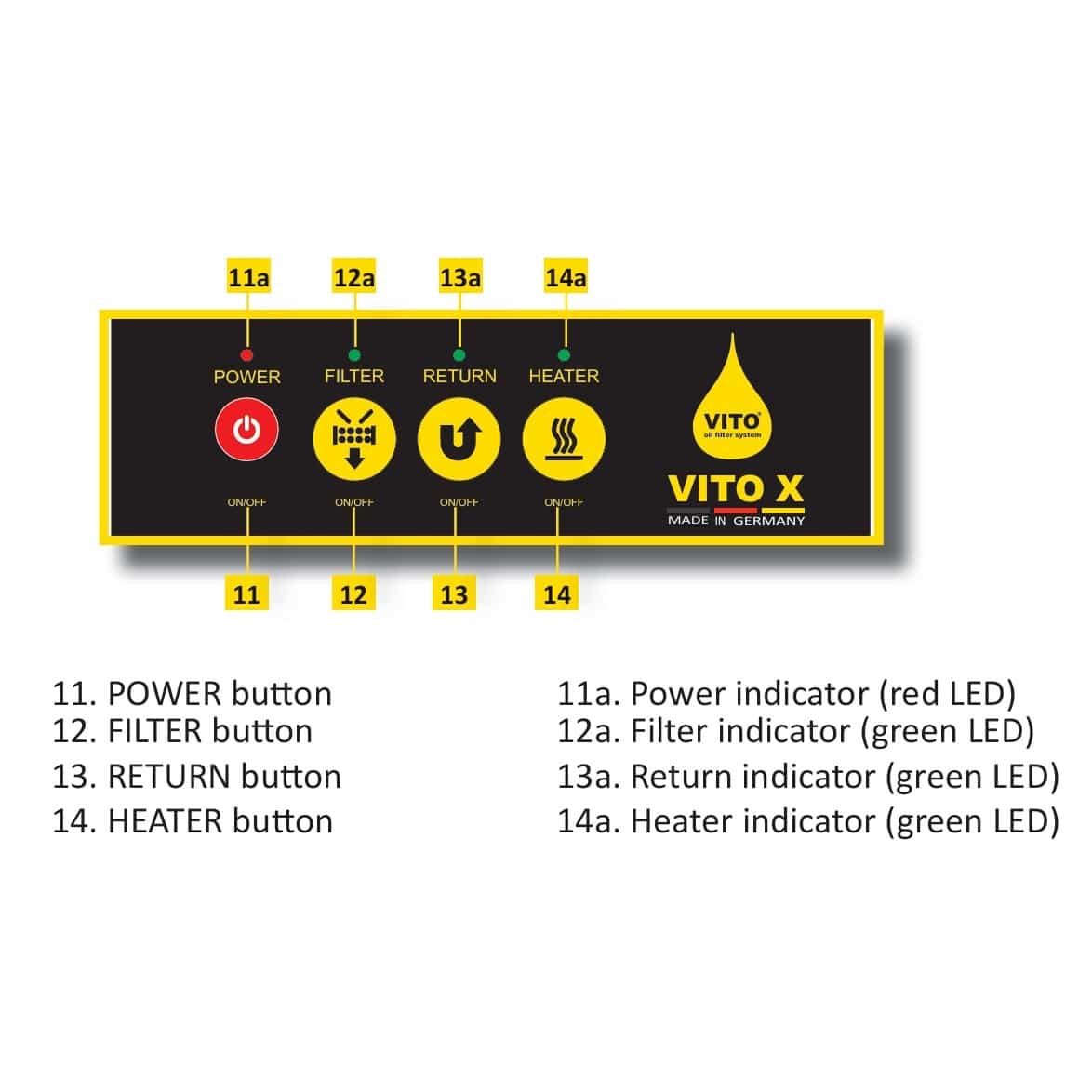 - Automatsko sigurnosno zaustavljanje – VITO se zaustavlja nakon 5 min usisavanja/izbacivanja ulja, odnosno nakon 30 min zagrevanja ulja