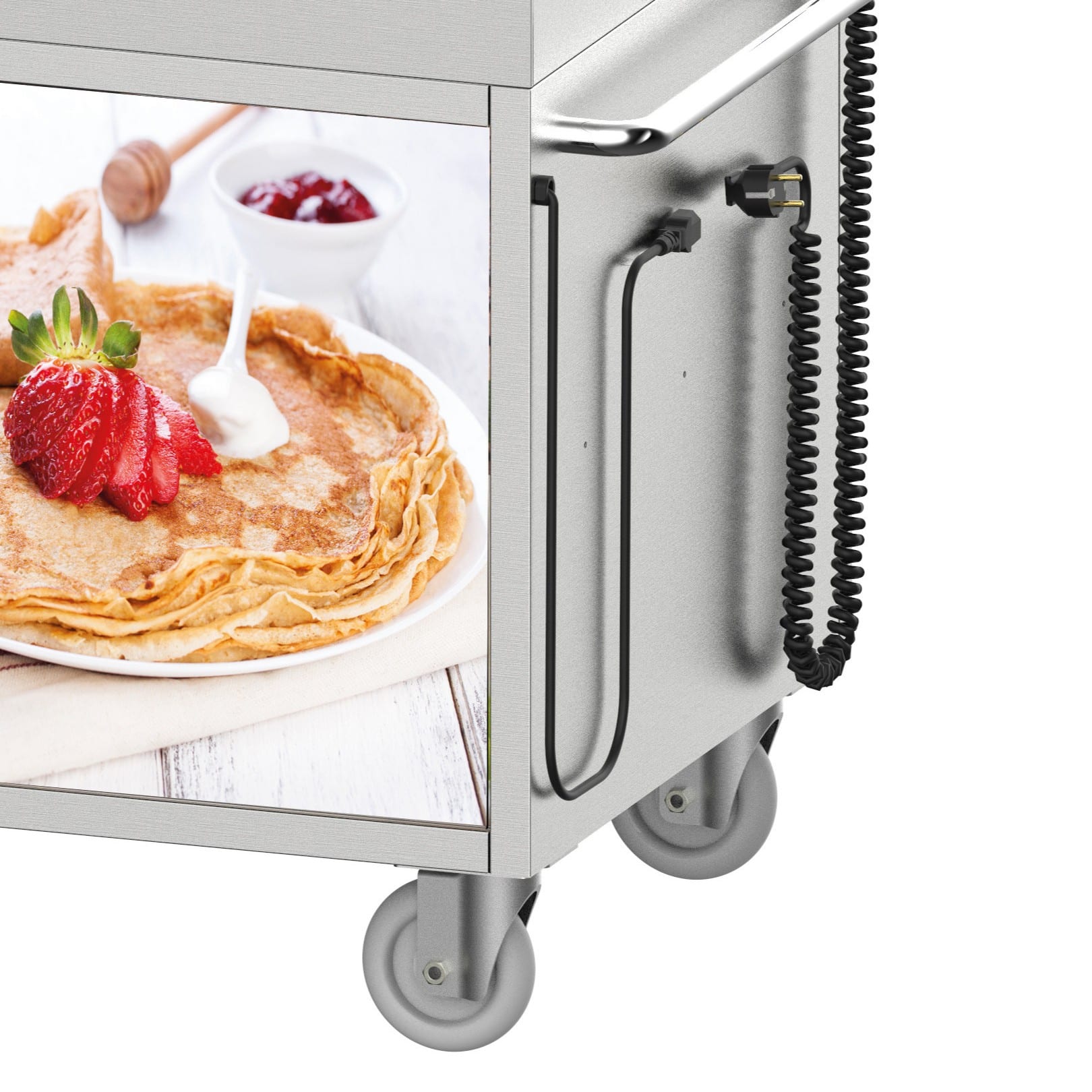 Mobilna kolica sa palačinkarom, napravljena od nerđajućeg čelika sa zaštitinim prozorom od kaljenog stakla koji se može ukloniti i grejanim ormarićem ispod.