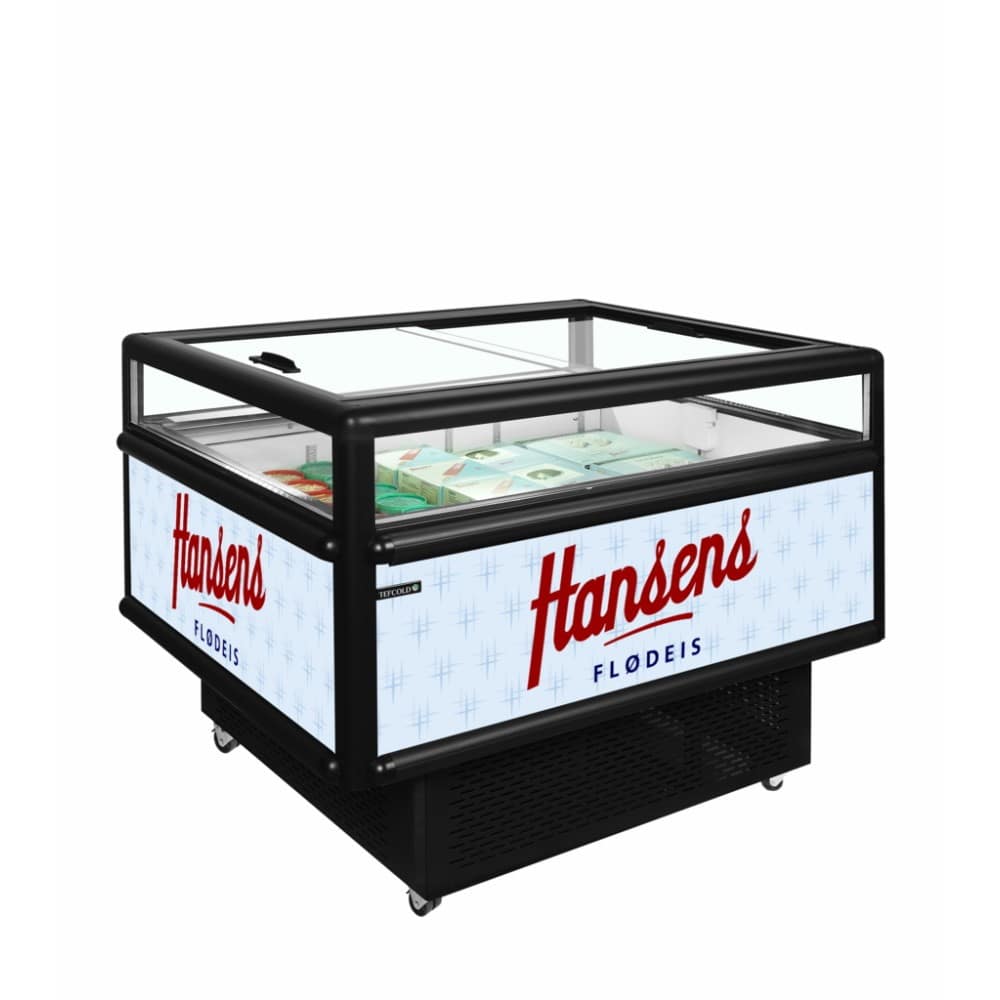 Ostrvo frižider/zamrzivač nudi impresivnu količinu prostora za skladištenje u poređenju sa svojom veličinom. Ima staklo na sve četiri strane, kao i staklene klizne poklopce za odličnu vidljivost proizvoda, bez obzira iz kog pravca kupac dolazi. Ispod staklenih stranica ima dovoljno prostora za brendiranje.