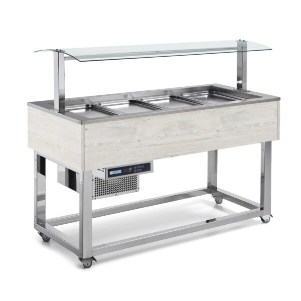 Essence Plus – hladni stolovi za samopolslužne linije napravljeni su od nerđajućeg čelika AISI 304, obložen drvetom (Wenge ili hemlock nordique), i sa robusnim hromiranim ramom na lepo dizajniranim točkovima za lakše premeštanje u objektu.