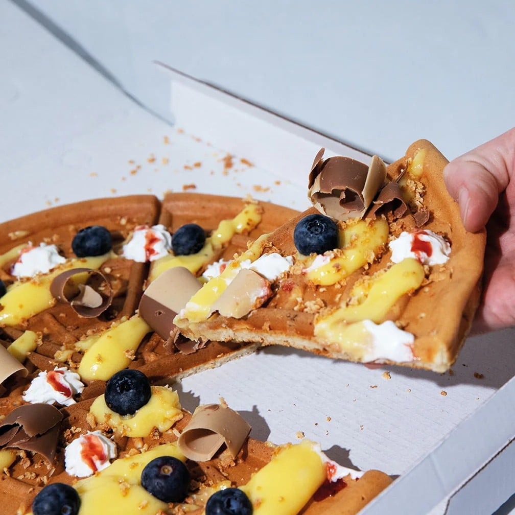 Slatka Pizza od waffla se može služiti baš kao i standardna pizza, u kutiji za picu, jer je waffle već perforiran na 6 trouglastih kriški. Ukrasite je slatkim nadevima, kremom, sladoledom ili voćem i time upotpunite dojam ukusa i izgleda ovog kreativnog proizvoda.