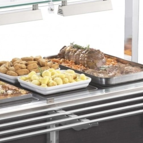 Essence Plus BROWN – Grejni stolovi sa pločom od kaljenog stakla za samopolslužne linije napravljeni su od nerđajućeg čelika AISI 304, obloženi drvenim panelima (Wenge ili hemlock nordique), sa hromiranim ramom na točkovima za lakše premeštanje u objektu i sa staklenom nadgradnjom sa halogenim grejnim lampama.