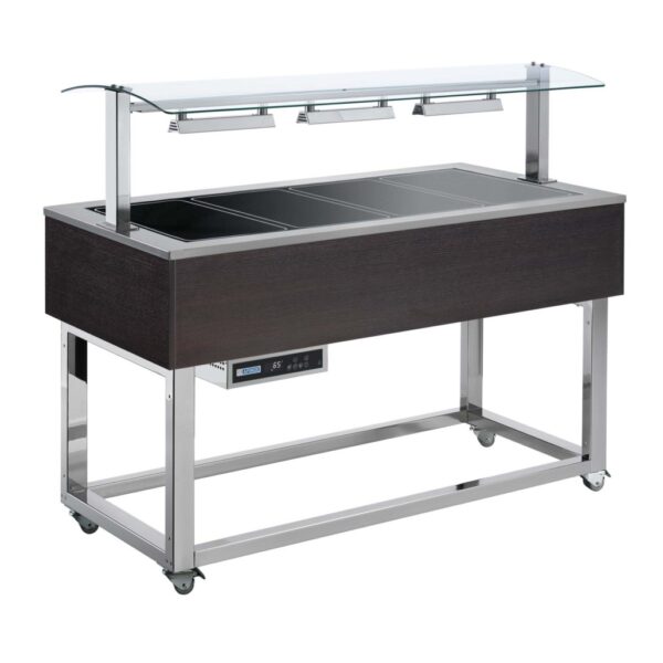 Essence Plus BROWN – Grejni stolovi sa pločom od kaljenog stakla za samopolslužne linije napravljeni su od nerđajućeg čelika AISI 304, obloženi drvenim panelima (Wenge ili hemlock nordique), sa hromiranim ramom na točkovima za lakše premeštanje u objektu i sa staklenom nadgradnjom sa halogenim grejnim lampama.